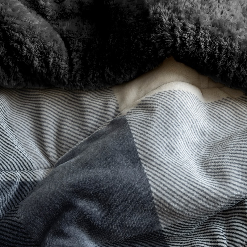 Cobertor invernal con primera vista de textura suave Beauty Soft y su segunda vista de borrega premium.