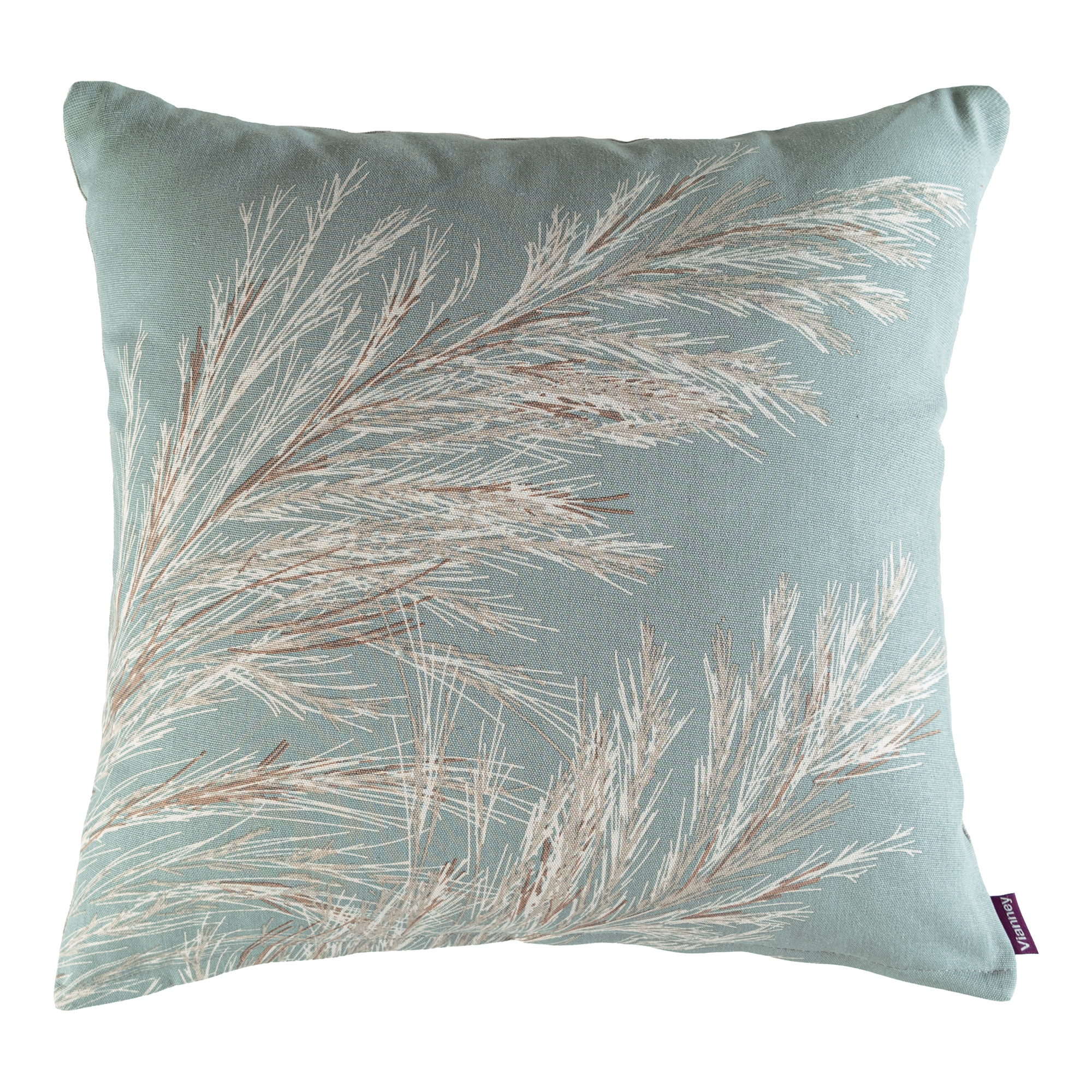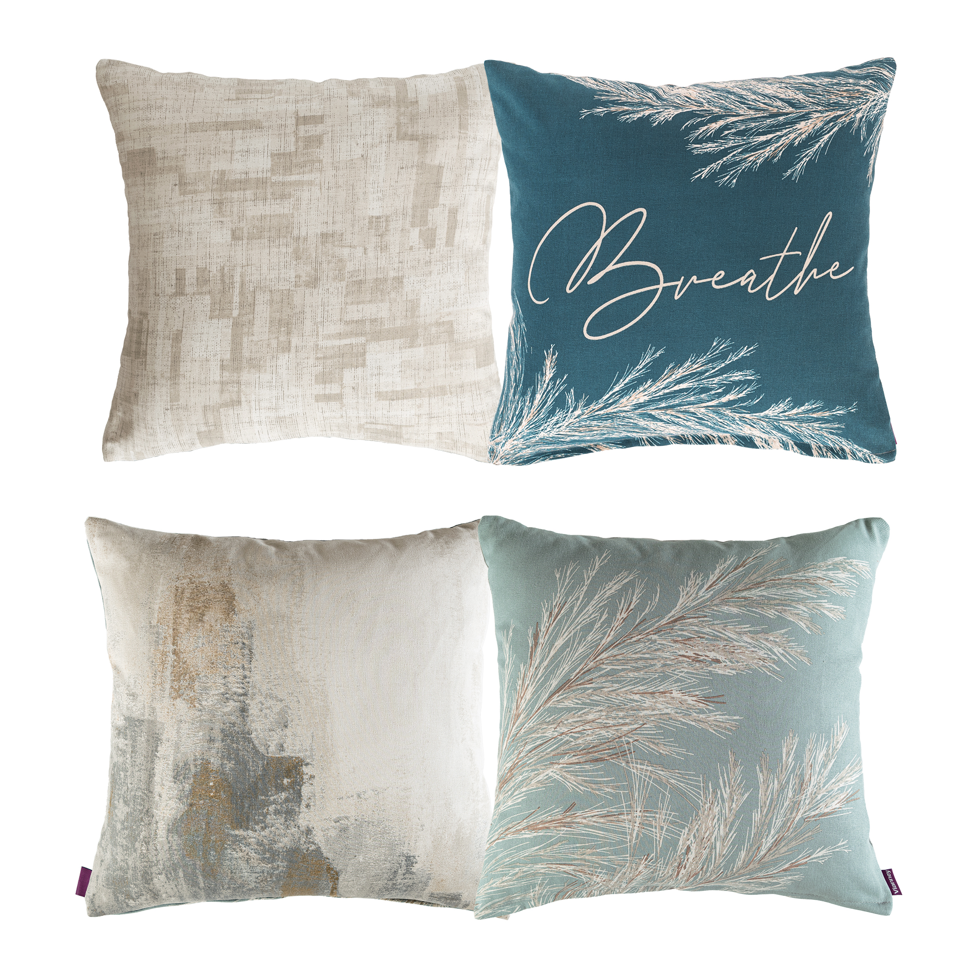 Complementa tus espacios con los tonos neutros y turquesas del cojín Pampas. Set de 2 cojines cuadrados, versátiles por su doble vista estampada.