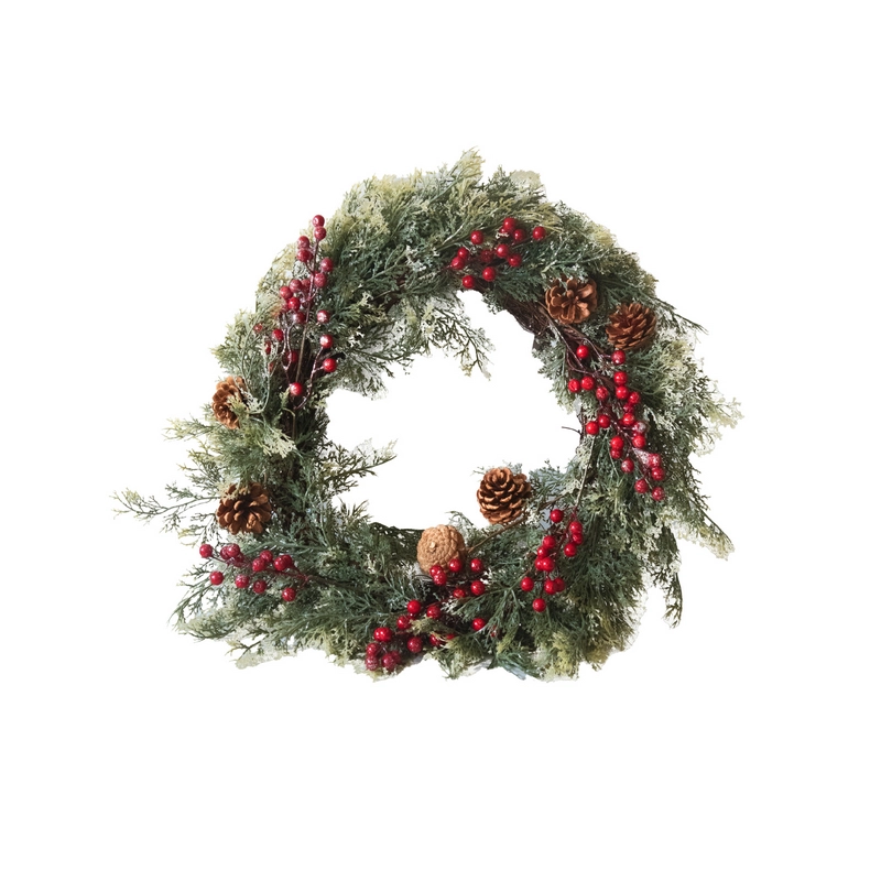 Bayas rojas, piñas naturales/artificiales y nieve ligera en las ramas. Guirnalda frondosa y bien distribuida, ideal para puertas, ventanas o chimeneas. *No incluye luces.