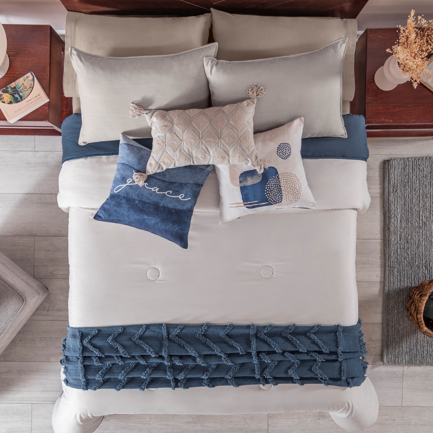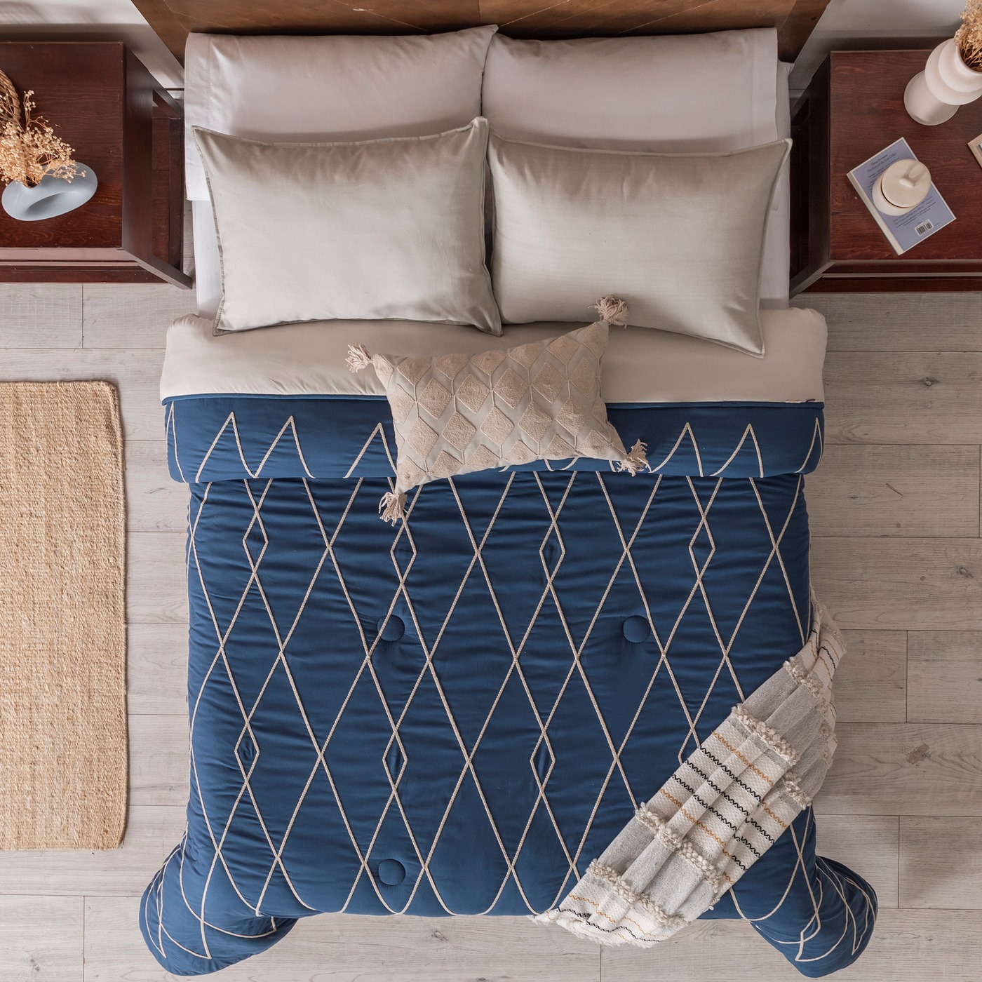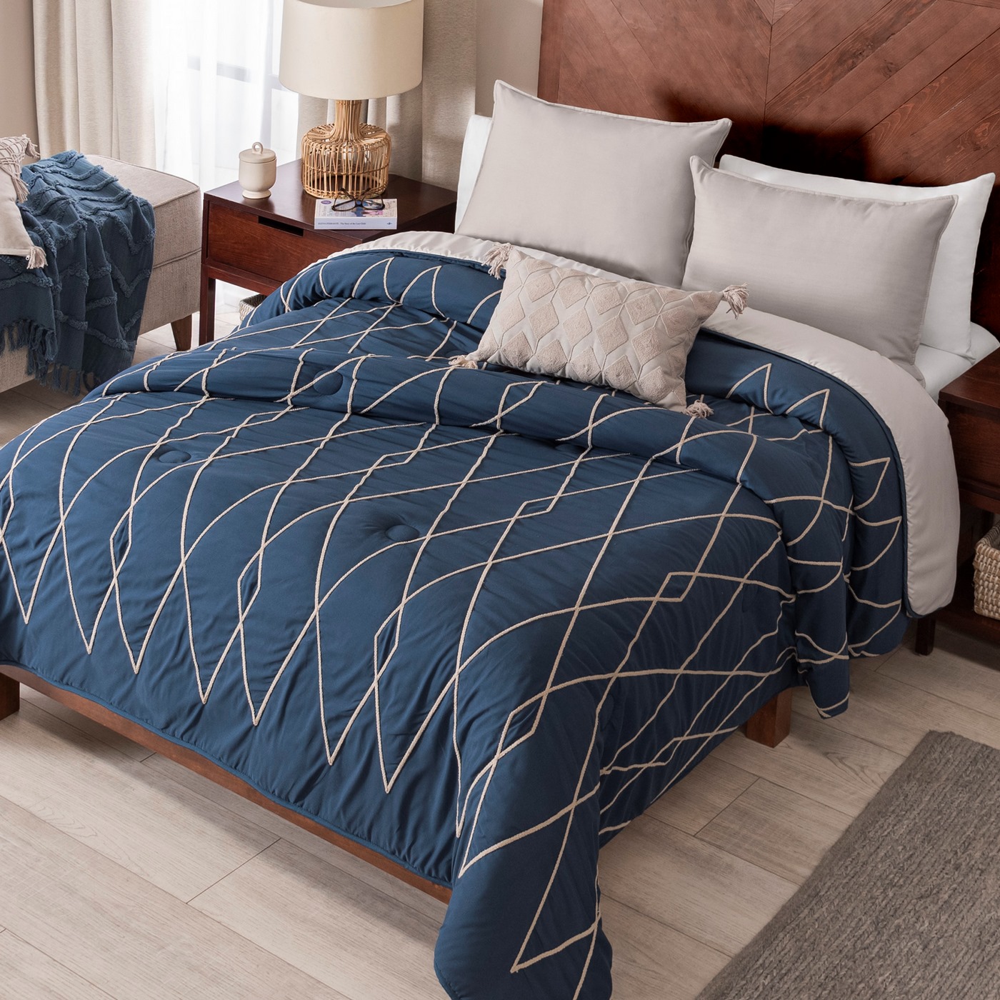 Crea una atmósfera acogedora y reconfortante con la paleta en azul intenso y greige, el bordado en cama y fundas será ese detalle único que buscabas. Juego de edredón doble vista. Suave por su textura viasoft. Delgado lo que lo hace ligero y fácil de lavar y de guardar.