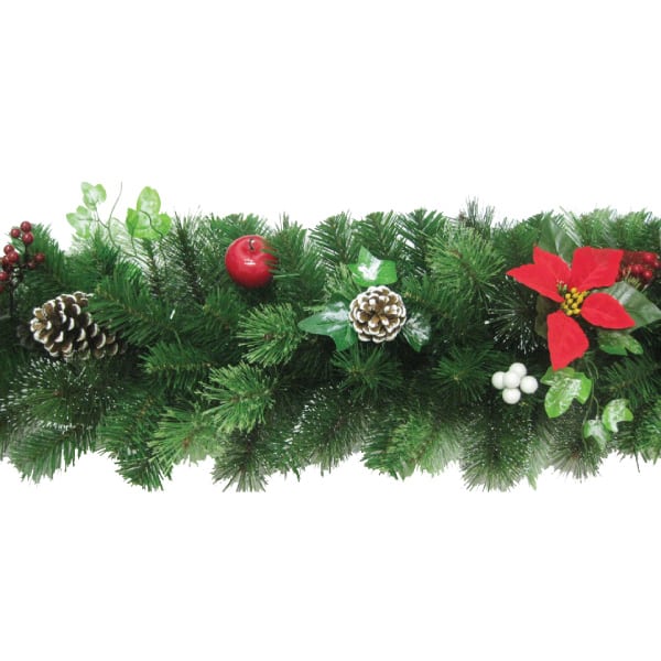 Luces LED integradas con figuras y elementos tradicionales, una estrella en la punta, racimos de bayas rojas y piñas naturales parcialmente blancas simulando nieve. Regulador de luces para mayor calidez y confort.