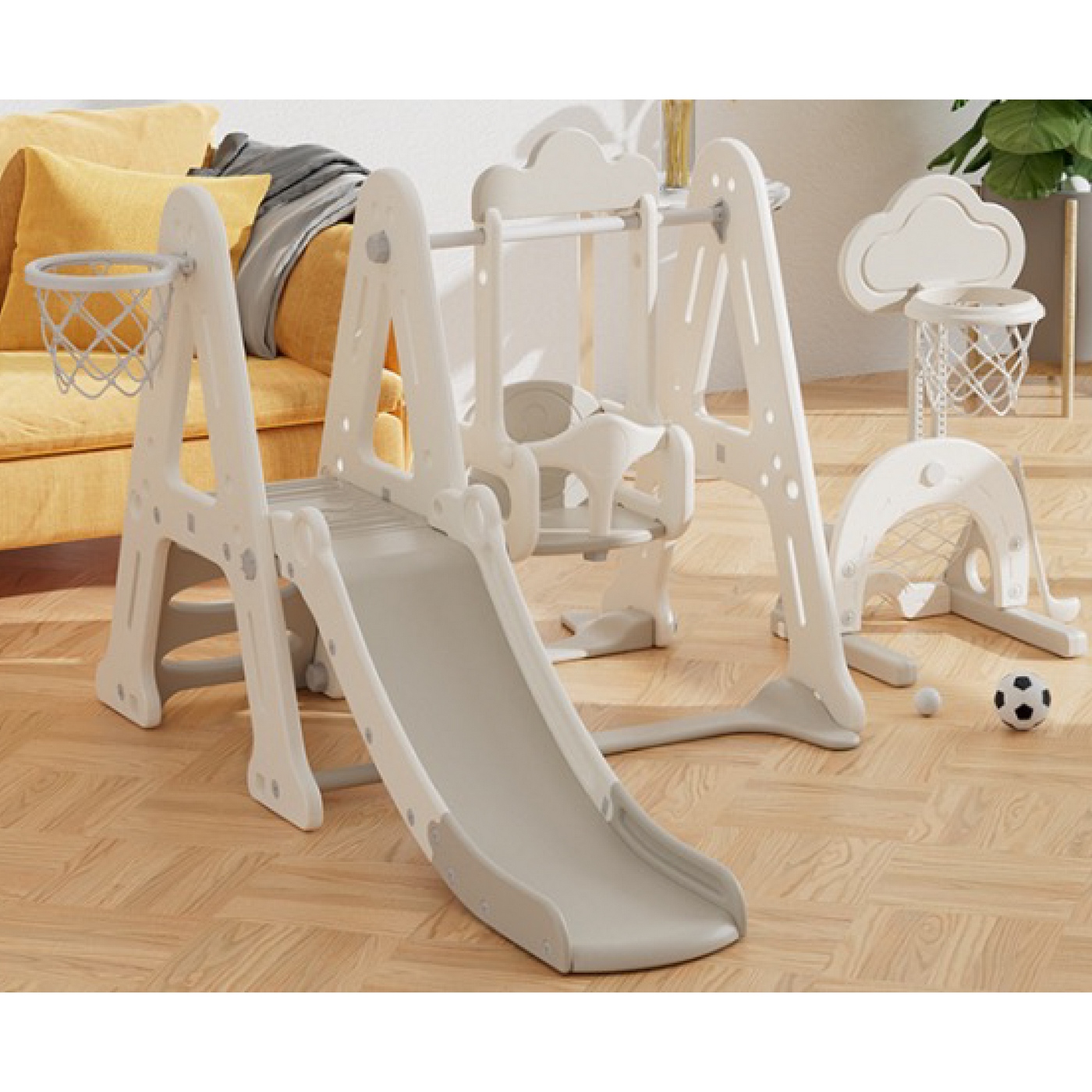 Incluye: 1 Playground Tobogán con Canasta y Hamaca Cancha de Basket y Fútbol 198 x 155 x 126 cm Canasta 50x54x108 cm